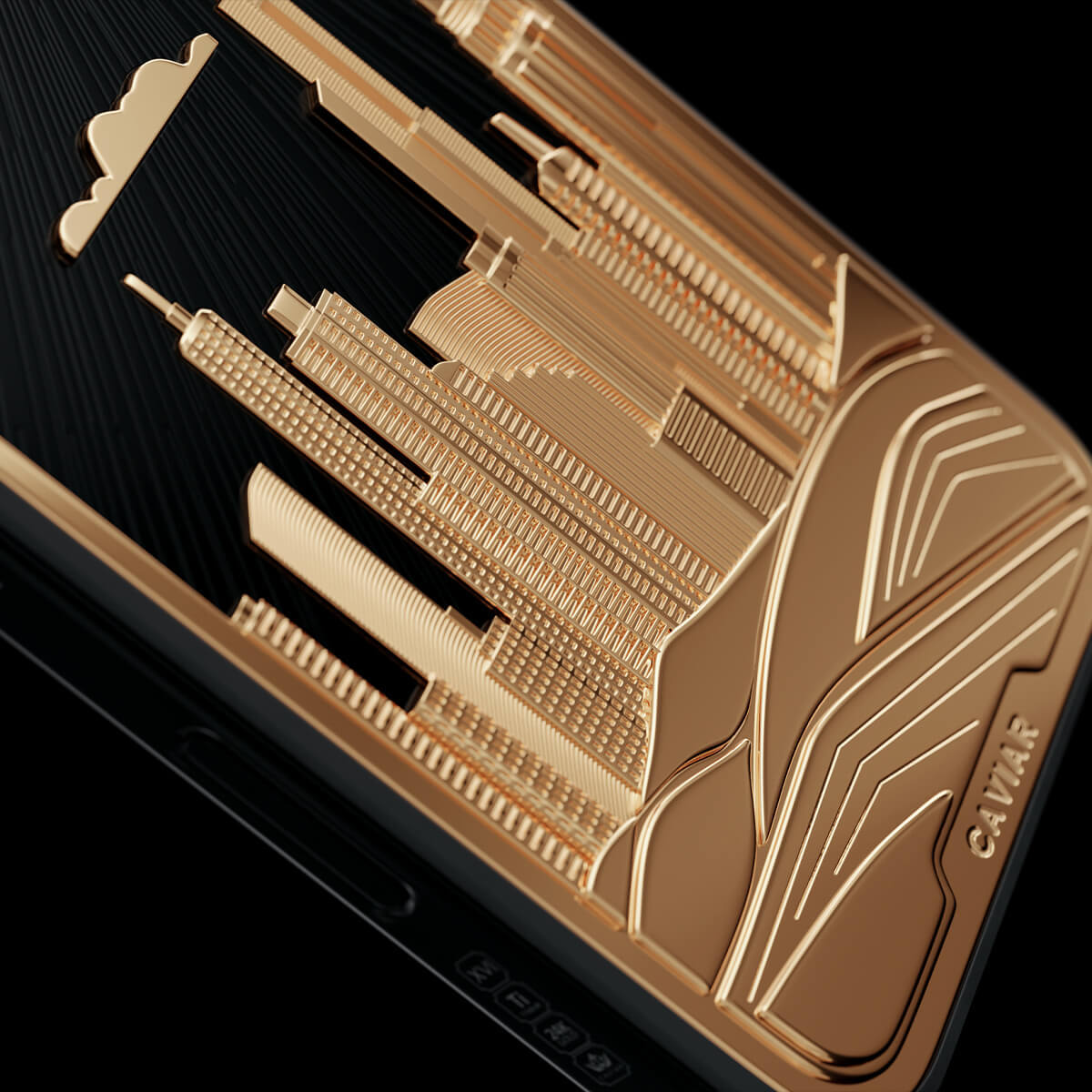 外观方面,本次推出的特别版 iPhone 17 Pro 大量融合了阿联酋国旗、著名的沙漠隼等意义非凡的象征元素,并结合坚固的黑色航空钛合金与纯 24K 黄金精心打造。