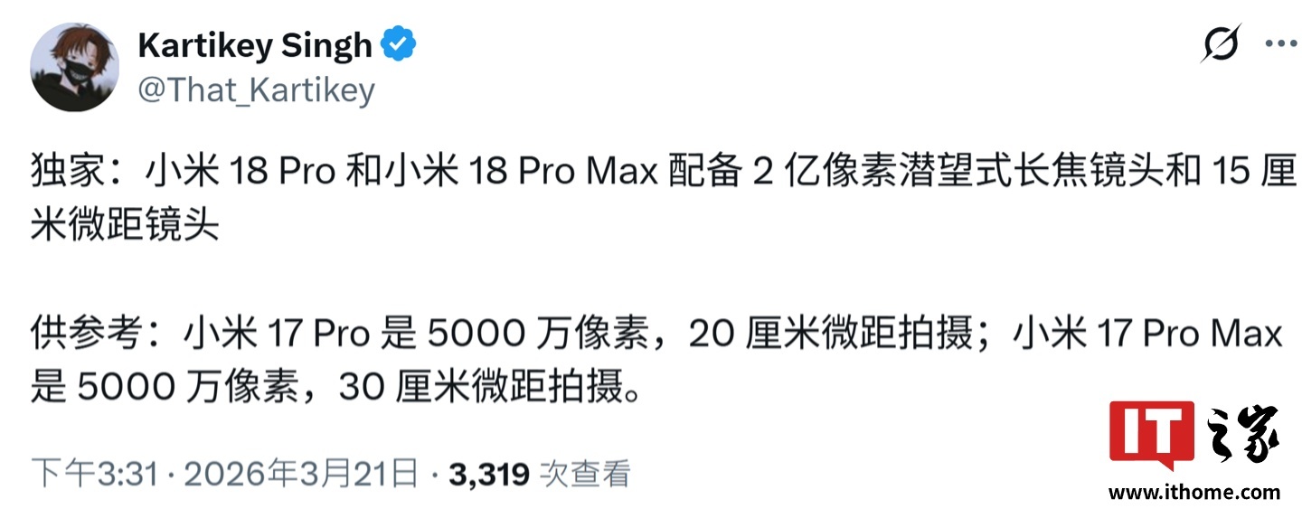 IT之家 3 月 23 日消息,消息人士 Kartikey Singh 上周(3 月 20 日)在 X 平台透露,小米 18 Pro 系列将是今年年底唯一一款搭载后置副屏的手机,并且也是唯一搭载 LOFIC+2 亿像素主摄 +2 亿像素长焦的小尺寸旗舰机型
